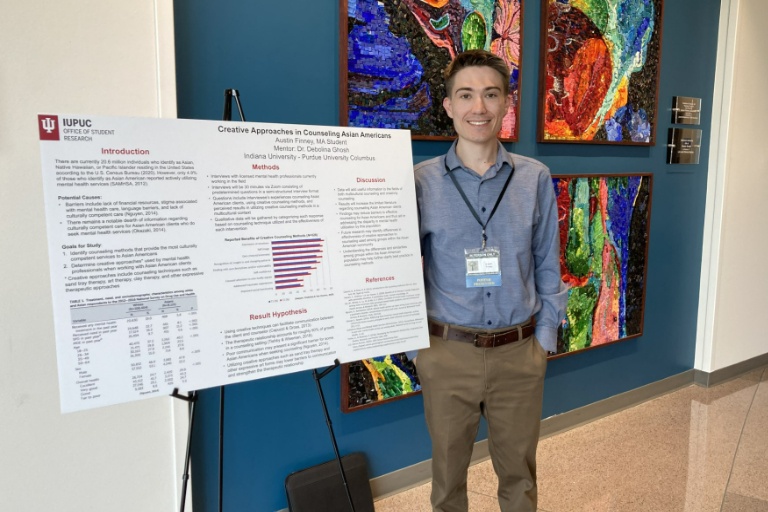 Finney’s project was also featured in IUPUC’s Office of Student Research exhibition on April 11. His faculty mentor is Debolina Ghosh, Ph.D., Director of Schoellkopf Community Counseling Center.