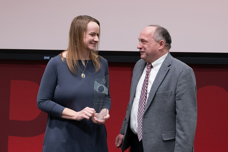 During an award ceremony Jan. 12, Reinhold Hill, Vice Chancellor and Dean of Indiana University Columbus, announced the 2024 recipients of the Excellence in Diversity Awards: Emily Dill, IU Columbus Library Executive Director and Associate Professor, and the Bartholomew County Public Library.