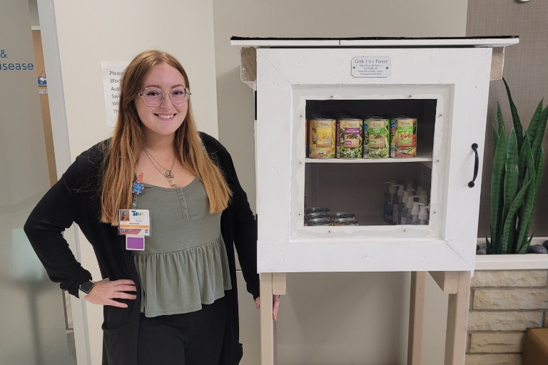 Kelley Mikels, a senior in the accelerated BSN program at IU Columbus, is helping dialysis patients eat healthier through meal kits, a cookbook and Free Little Pantry at Major Health Partners (MHP) Shelbyville Hospital.