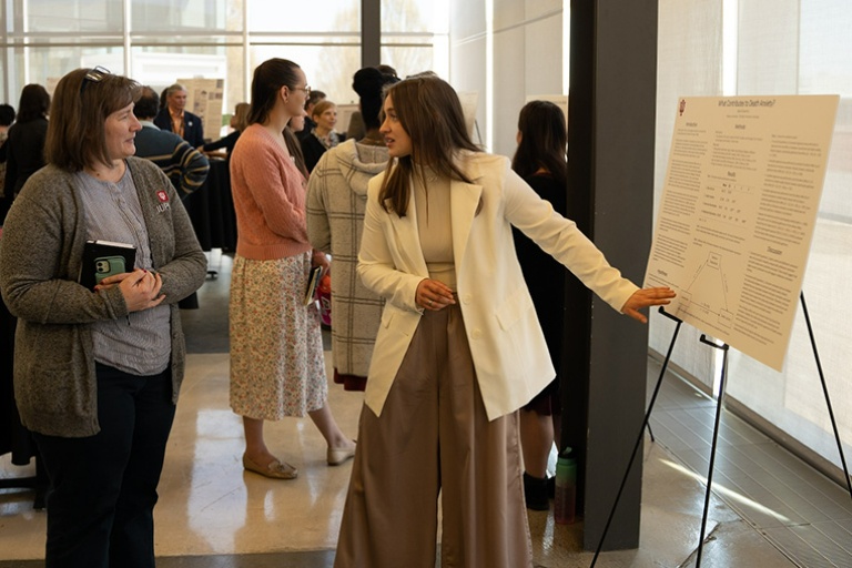 The public is invited to IU Columbus on April 16, 2024, to learn about student research projects covering a wide variety of topics, including naturally occurring plastics, the opioid crises’ effect on the economy, how to support human trafficking survivors, and much more.