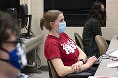 Blewett organizes the event in which 109 submissions were publicly displayed on IU East’s Twitter site and on the 13-foot wide and 7.5-foot tall First Bank Richmond Tech Zone and IQ Wall in the Whitewater Hall Lobby. Student writings published on Twitter can be found with the hashtags #writing&processing, #writing&connection, #writing&resilience or #redwolveswrite. She said many of the students had photos taken next to their submissions when they showed up on the large display of tiled flat-screen monitors.