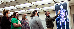IU East School of Natural Science and Mathematics faculty and staff learn how to use the tools of the Anatomage Table. From right to left: Stephanie Lee, adjunct lecturer in biology; Jenilee Braun, assistant lab manager and IU East alumna; Mary Blakefield, associate professor of biology; Heatherlynn Barrett, laboratory coordinator and Brian Olson, lecturer in biology.
