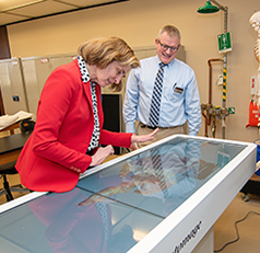 Brian Olson, lecturer in the School of Natural Science and Mathematics, and Heatherlynn Barrett, laboratory coordinator, demonstrated the Anatomage virtual dissecting table, a state-of-the-art teaching tool allows students to learn human anatomy by providing a life-sized display of the human body. The table is used to help prepare students for careers in health science.