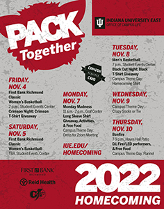 Indiana University East will host “Pack Together: Homecoming 2022” November 4-10. Alumni, friends and the campus community are invited to participate in activities and events throughout the week.