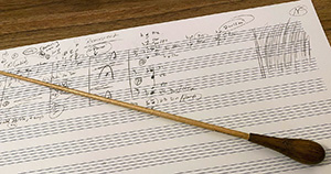 It features a musical collage of wall prints and drawings. A flute and saxophone. A conductor’s baton. Complete compositions. A wooden desk. Drawing and writing utensils. And a lot, lot more.