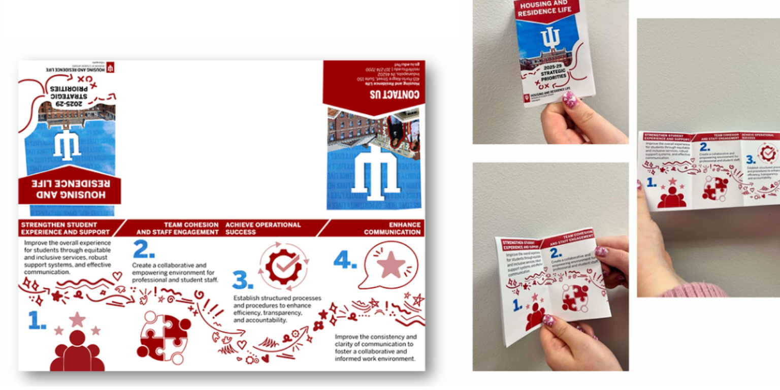 This booklet was created for the Housing and Residence Life (HRL) team so staff members had a compact resource they could refer to when reflecting on HRL’s strategic priorities. Mary’s goal was to create a visually engaging piece with movement.