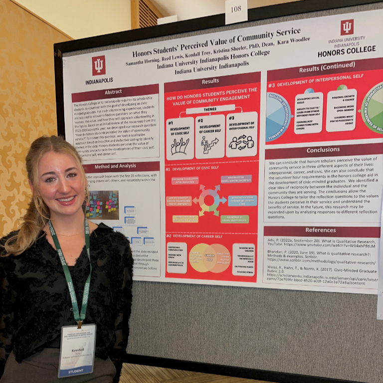 Data science student Kendall Troy shared how 1RIP, a research initiative for first-year students, deeply impacted her. “With this program, I had an opportunity to present research nationally at the National Collegiate Honors Council in San Diego. This was an amazing chance to meet with honors colleges outside of IU Indianapolis and network with like-minded peers.”