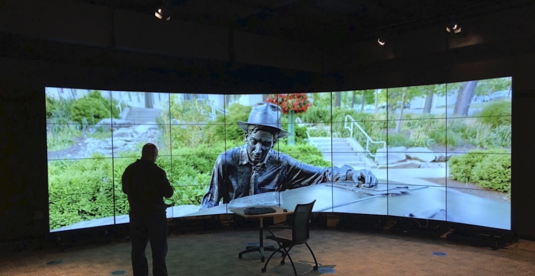 But what happened to the museum’s old IQ-Wall? Normally, A/V equipment and computers would be removed and surplussed according to IU’s policies and, in this case, much of the old gear followed this well-worn path. But not all of it. Some of the displays were put into service once again as a mobile display column welcoming visitors or detailing Museum events, workshops, or outreach efforts. Instead of adding to a landfill, they add to the museum experience.