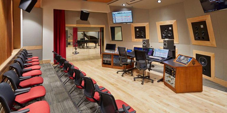 The Georgina Joshi Recording Studio was completed in 2018 and was made possible by a gift from the Georgina Joshi Foundation. According to their website, “The studio features a 48-input Pro Tools HDX system with an Avid S6 control surface, 7.1 surround sound monitoring, and is designed for a hybrid analog-digital workflow. The main studio can accommodate up to 25 musicians and has four isolation booths. The Joshi Studio hosts advanced multitrack studio classes and is frequently used by Jacobs School ensembles, faculty, and guests for recording projects.” Virtually explore the Georgina Joshi Recording Studio via the IU3D Hub.
