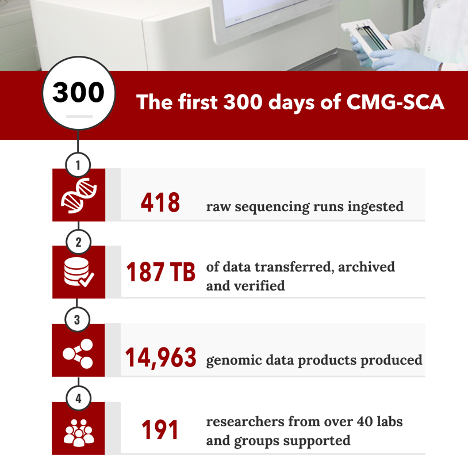 In 2020, despite a 3-month shutdown owing to the pandemic, CMG received over 7k samples for quality assessment and processed/sequenced 4,324 samples. All of this translates to massive amounts of data (more than 100TB of raw sequencing data every year), data processing challenges, and significant difficulties providing processed data back to the research community. In spring 2020, CMG entered a partnership with the RT Scalable Compute Archive (IU SCA) to develop an integrated system consisting of a secure archive, pipeline processing capabilities, and user-friendly data distribution functionality. The new service, CMG-SCA - data access restricted to CMG clients), in its first 300 days of production operations has served close to 200 users from nearly 40 labs and research groups.