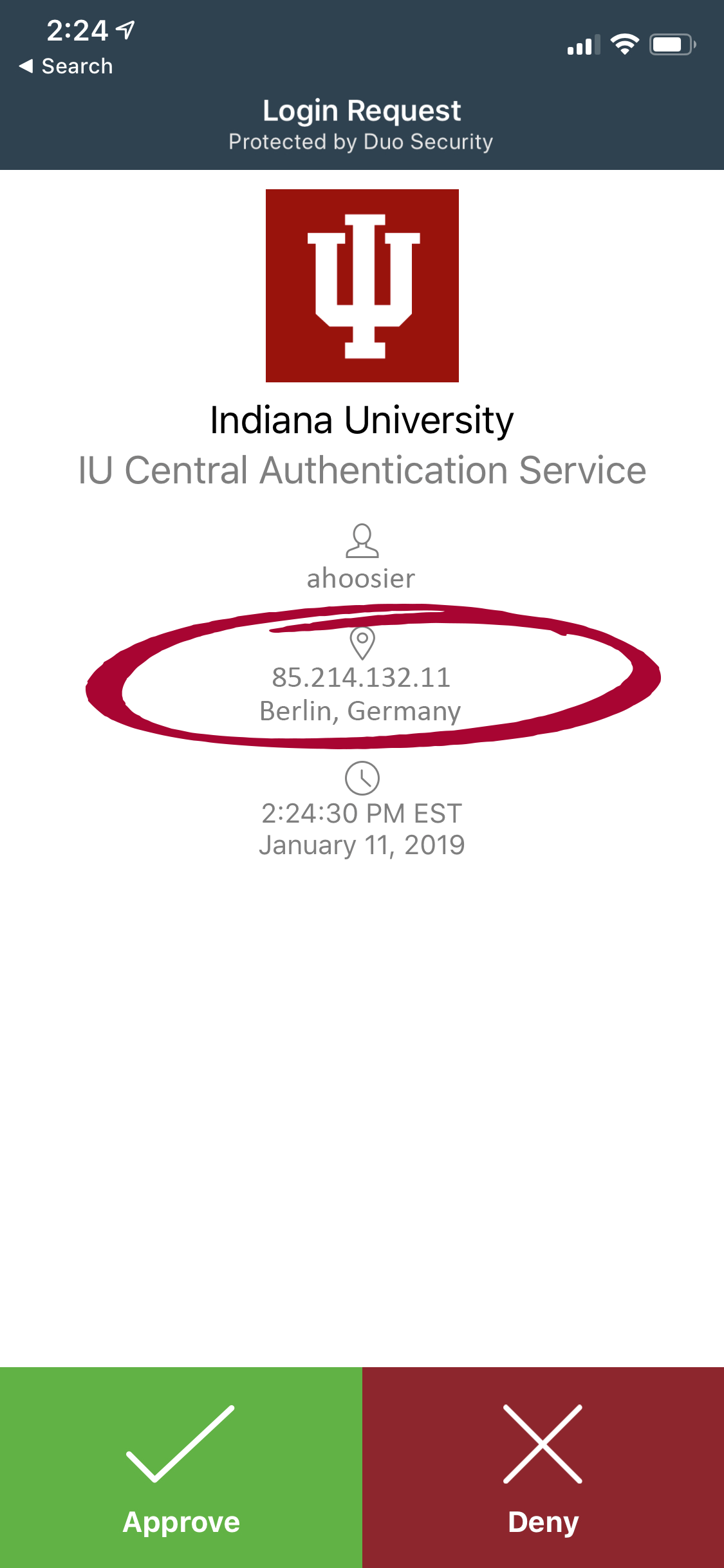 DENY, DENY, DENY. If the app indicates the login is coming from a foreign country or far away from your current location, that’s usually an indication of fraud, and you should push the red “X.”