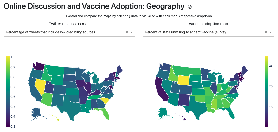 The CoVaxxy dashboard consists of interesting and informative graphs that help visualize the percentage of people in a given state that are unwilling to accept the vaccine. There are also graphs visualizing the percentage of related hashtag usage, the percentage of all posted tweets using low credibility and mainstream sources, and the most shared low credibility and mainstream sources in the past week.
