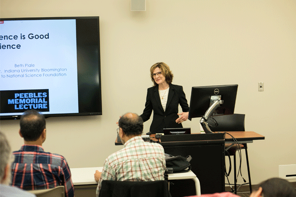 Dr. Beth Plale, program officer at the National Science Foundation and professor in IU’s Department of Intelligent Systems Engineering, delivered the Peebles Memorial Lecture on the topic, “Open Science is Good (Data) Science.”