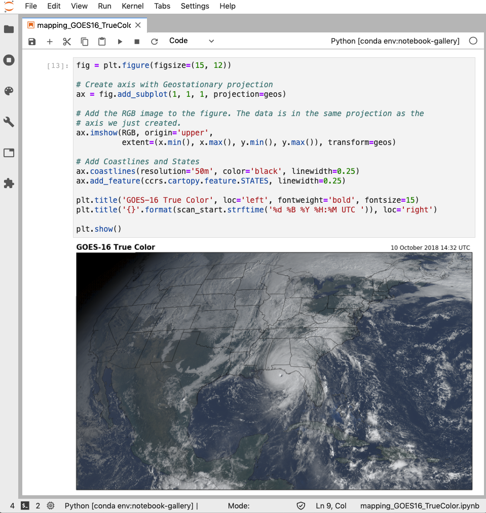 Unidata Python Gallery GOES-16 true color notebook by Brian Blaylock, available via the Unidata JupyterHub.
