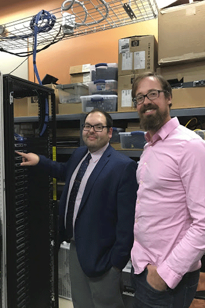 Adam Erck (left), director of the CCLA at Doane University, and Eric Coulter, XCRI engineer, pause for a pic in the process of powering up compute nodes on Onyx.