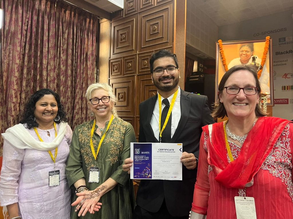 A highlight of the visit was attending the International Conference on Gender and Technology at Amrita Vishwa Vidyapeetham. The conference aimed to explore the intersection of technology and gender, highlighting how technological innovations can empower women and address gender disparities. Associate Professor Sherri Bucher co-chaired a panel on (Women’s Health and Sanitation in the Digital Age) while Harsh Patel, a student from IU Indy, presented his research paper on bridging the gender gap in the SDGs at the conference.