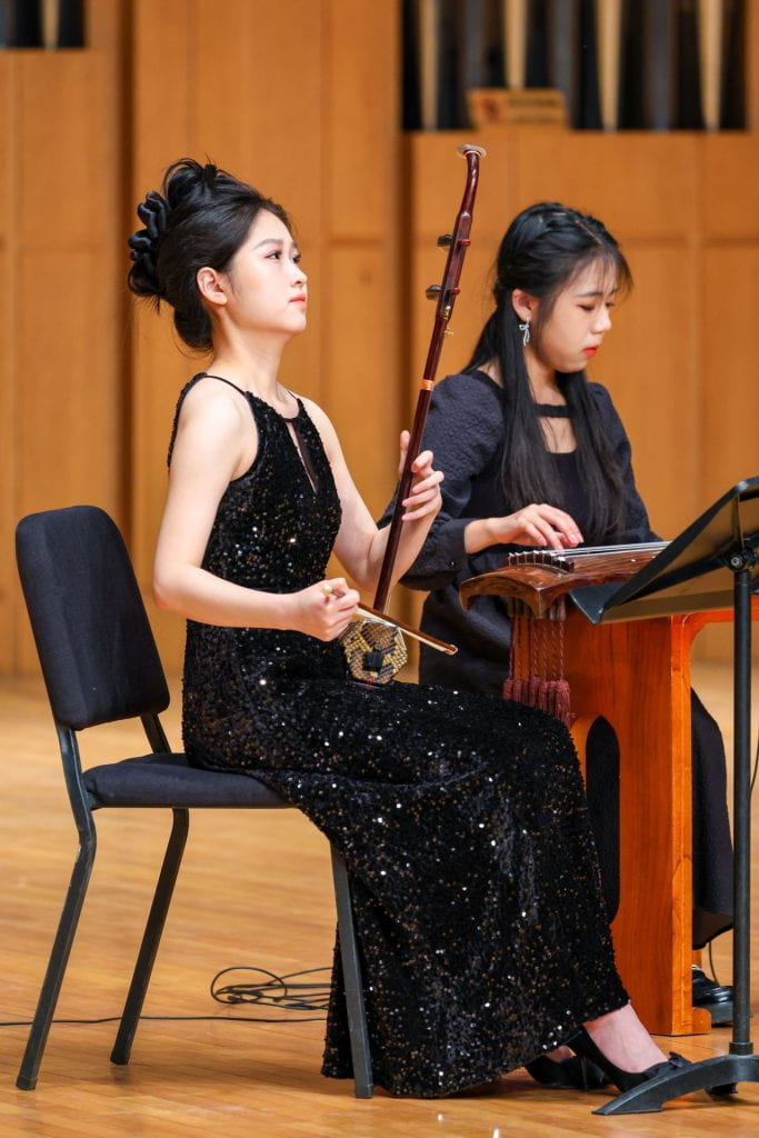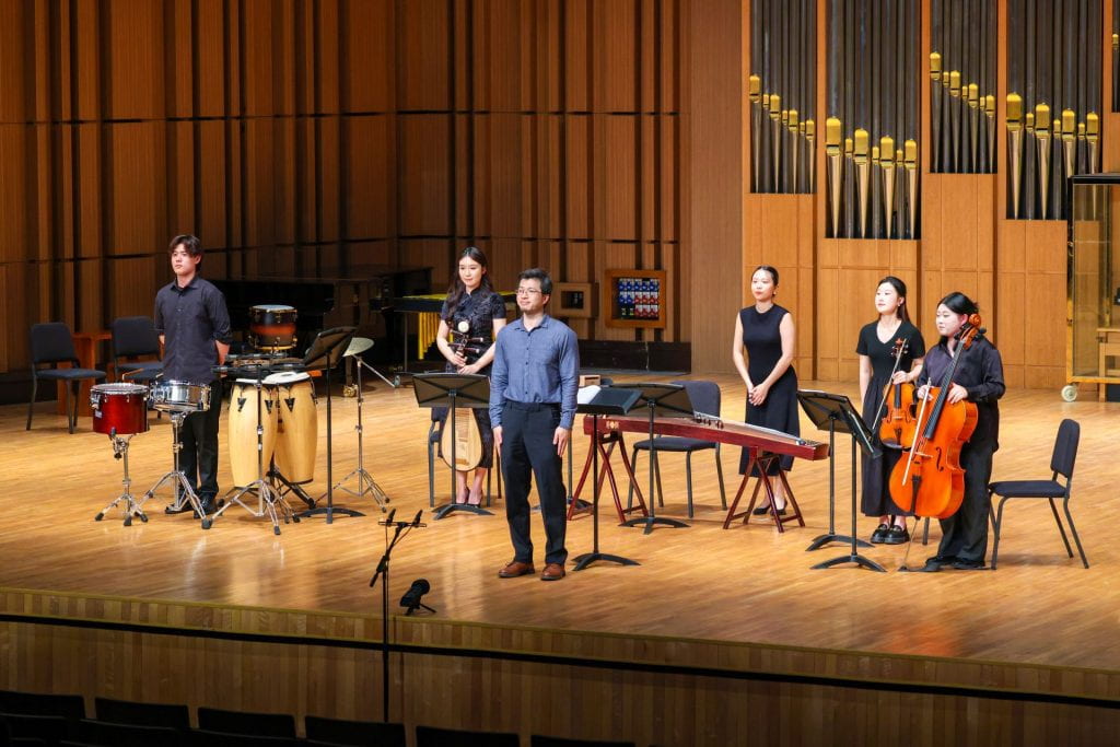 Chang was inspired to initiate this project two years prior, after observing his talented classmates and colleagues at countless rehearsals. “Watching performances at Jacobs, I had noticed a heavy focus on classic pieces,” Chang recalled. “I felt there was a need for initiatives with a more modern grounding.” The collaboration commissioned four IU composition students to write works for small chamber ensembles featuring both Chinese traditional instruments – the pipa, guzheng, erhu, dizi, guqin, and Chinese percussion – and Western orchestral instruments. Additionally, the project included online workshops led by Zhejiang Conservatory students, multiple rehearsals to ensure professional-level performances, and a final concert to showcase the new compositions, held on May 16, at Zhejiang. This collaboration offered a fresh opportunity to blend traditional instruments from the East and West, creating a space for students to explore new musical possibilities.