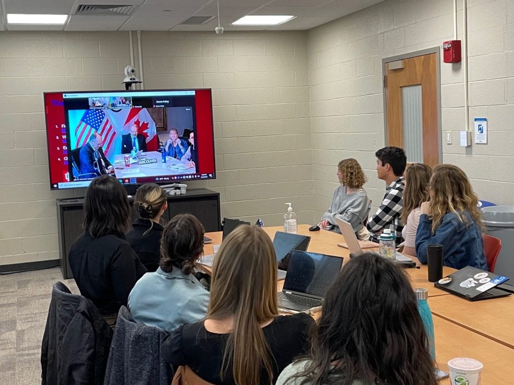 Students and instructors kept in touch with Consular staff through email and video conversations throughout the semester. After completing the report, Joseph Bergen, the Chief of American Citizen Services, arranged for students to brief DeHart and other senior officials on their findings, along with several consular team members at other sites across Canada. The briefing took place via videoconference on December 8.