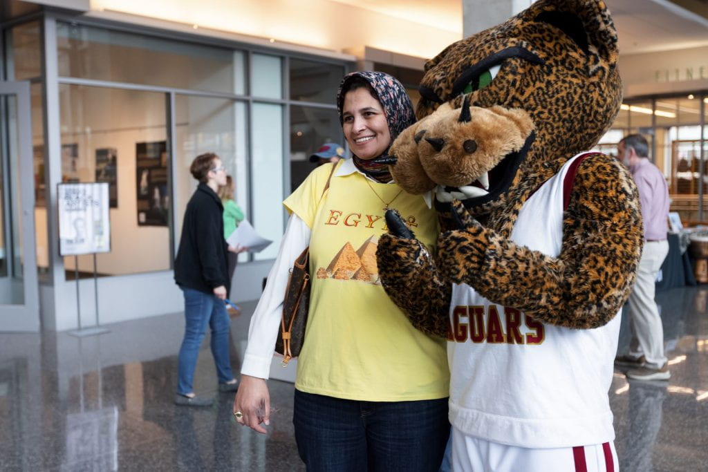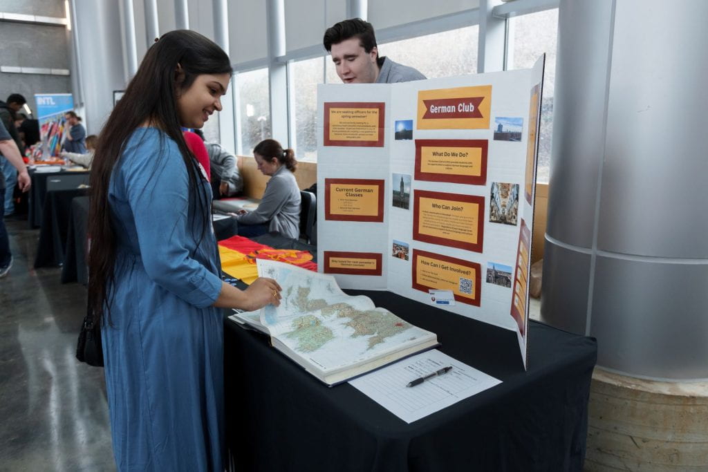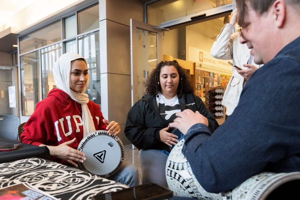 With sounds of Egyptian tablas and Chinese lion dancing drums echoing through the Campus Center, the lectures on the third floor provided an opportunity for faculty and students to share their expertise outside of the classroom. In one session, “Green Teams,” which are informal staff committees dedicated to creating a more sustainable workplace, shared ideas and their perspective on the global impact of sustainability. As Valentine’s cards and international poetry in each of the seven languages taught at IUPUI were shared on the first floor, graduate students shared their in-depth analysis of multilinguistic literary works. Whether it was learning Chinese calligraphy, what their name looked like in Arabic, or what traditional mehndi designs look like on their hands, visitors explored the depth of the global community on campus.