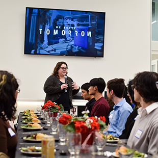 Creativity included a new Luddy School meet-eat-and-mingle event, plus an etiquette dinner, both at Luddy Hall, the night before the fair. Students met with nine employers on each level of the building to “see where learning happens and get them excited about hiring,” Hannon says.