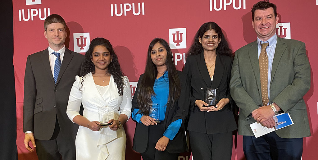 The Luddy Indianapolis students were among those honored April 9 at the Elite 50 Awards Celebration (pictured above, from left: Karl MacDorman, Ph.D., Luddy Indianapolis Associate Dean of Academic Affairs and Associate Professor of Human-Computer Interaction and Artificial Intelligence; Elite 50 honorees Koya, Moncy, and Vemparala; and Davide Bolchini, Ph.D., Luddy Indianapolis Executive Associate Dean).