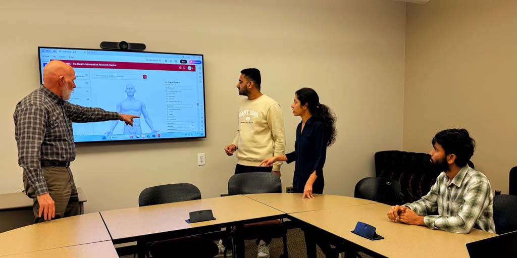The Luddy School’s BioHealth Informatics Research Center is preparing to launch a website that will allow wider access to the database. “We wanted to get a sufficient amount of data and have a UX/UI system that was glitch-free before moving it to the public,” says BHIRC Director Gary Schwebach (pictured above from left with BioHealth graduate students Kanungo, Thrinithi Polsani, and Narendrareddy Munagala).