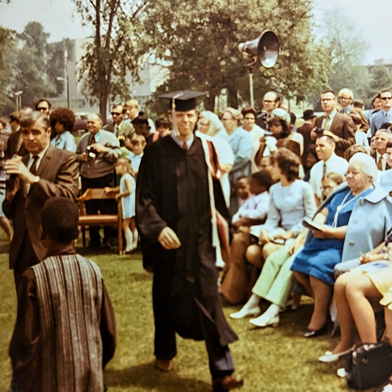 The building where he worked as an assistant placement director was gone. He was able, however, to point out where he walked across the stage at graduation and shared the photo with the students and faculty during his visit.
