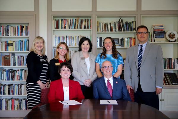 Hanover, Ind. – In a rare public-private partnership, Indiana University Southeast Chancellor Debbie Ford, and Hanover College President Lake Lambert, signed a memorandum of understanding establishing an expedited admissions pathway for Hanover College graduates into select IU Southeast graduate programs.